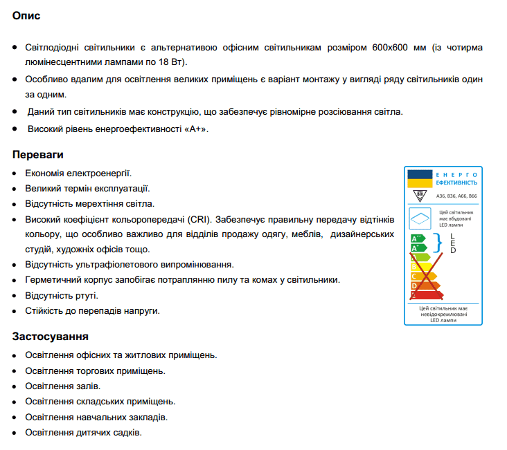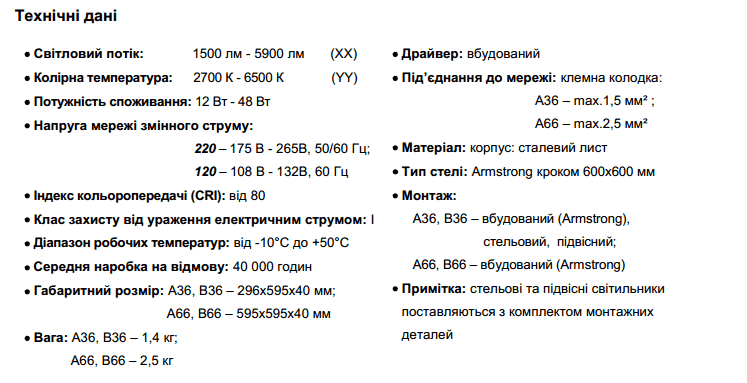 Світлодіодні світильники призначені для монтажу у підвісну стелю типу Armstrong, а також як стельові чи підвісні, при монтажі їх безпосередньо до стелі або на окремих конструкціях.