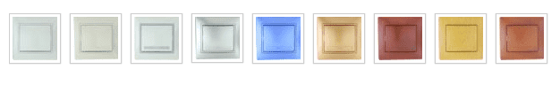 Основні кольори розеток та вимикачів Lezard: базовий колір - білий і кремовий; колір металік - золото, синій, сірий, чорний; колір під дерево - вишня, вільха, сосна, світлий горіх, темний горіх. Базовий колір серії MIRA супроводжує широка палітра декоративних вставок. Вироби із забарвленням «під дерево» і «металік» виготовлені з пофарбованого «під фактуру» пластика, а не обклеєні кольоровою плівкою.
